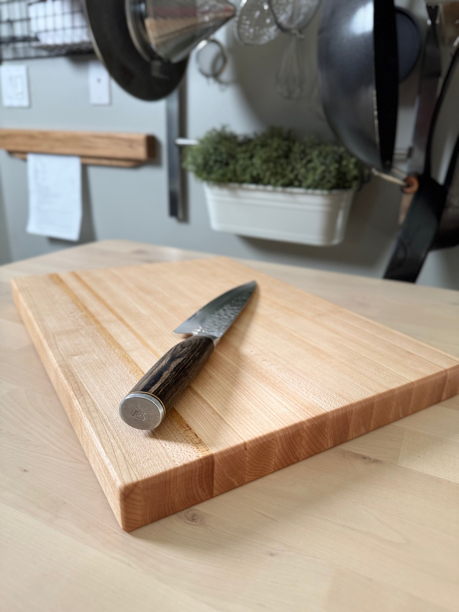 Crafted from durable hard maple, this edge grain cutting board offers a clean, refined look with reliable everyday performance. The smooth surface is easy to maintain, while the light tone of the maple add a natural touch to any kitchen. Built for daily use, this board combines simplicity, strength, and practicality.