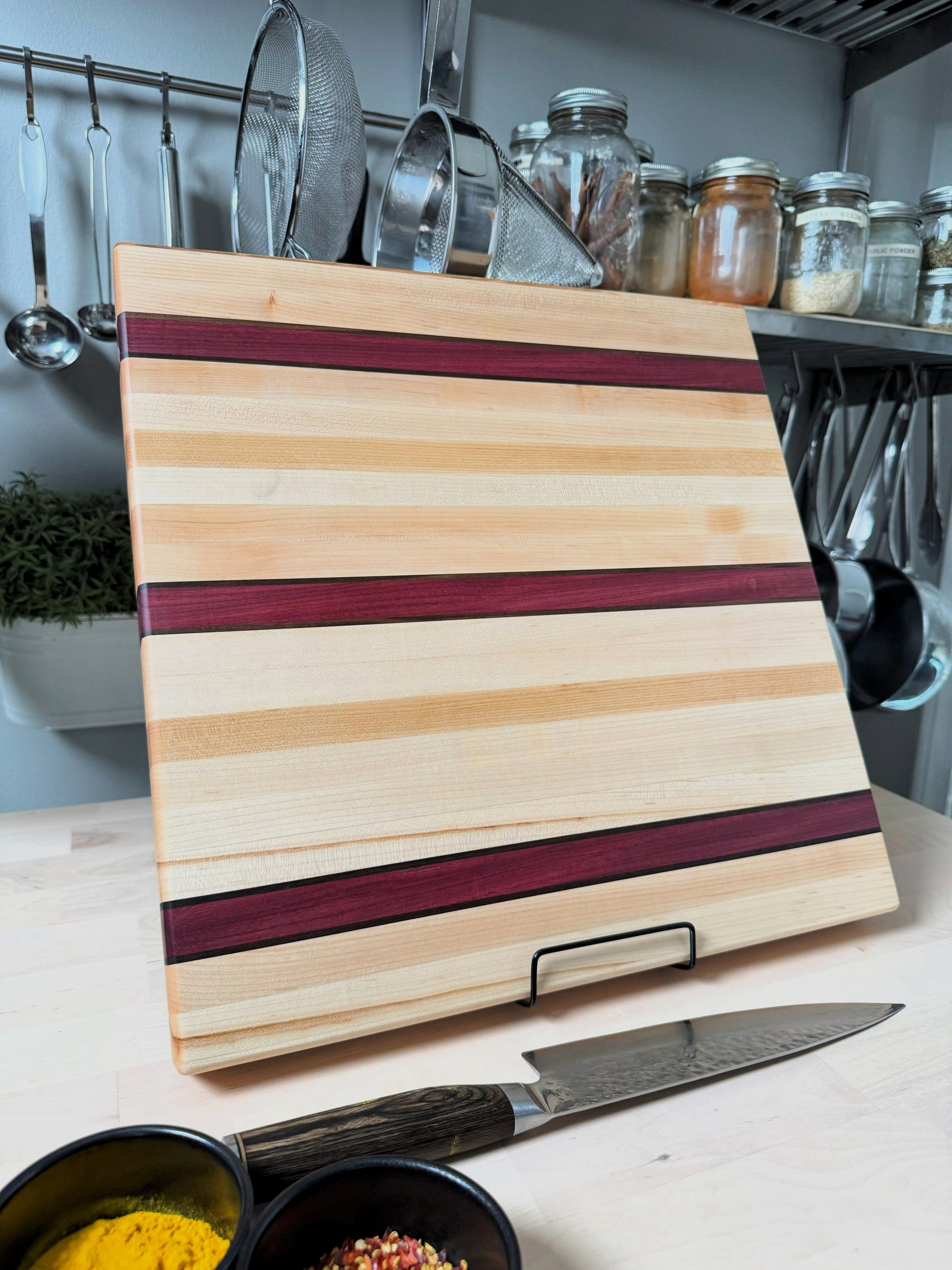 The ROSEHILL cutting board blends warm maple with bold purpleheart and walnut accents for a refined, symmetrical look. Durable and ready to go for years of everyday use & daily prep.